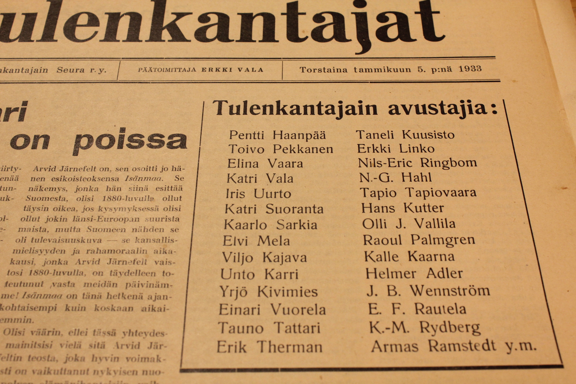 Dal punto di vista poetico, negli anni ’20 si distingue un movimento d’avanguardia di giovani che si fanno chiamare Tulenkantajat, “Portatori di torce”. Il loro slogan era “Apriamo le porte all’Europa!”, e infatti uno dei punti cardine della loro poetica era il cosmopolitismo: il loro leader, Olavi Paavolainen, viaggiò molto, in particolare in Francia, meta dei principali artisti dell’epoca, e raccolse le sue impressioni in vari diari di viaggio. I Portatori di torce erano romantici, idealisti, bohémiens attirati dalle mille possibilità dell’Europa ma allo stesso tempo affascinati dalle zone più esotiche e spirituali della Finlandia stessa; e così i frequenti incontri dei membri del gruppo avvenivano in un’atmosfera indefinita ed eccentrica, tra danze in costume, candele, incensi, versi di poesie attaccati sulle pareti.