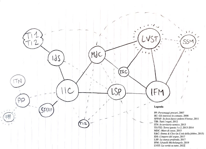 Trovai che questa soluzione avesse un potenziale interessante, così ripetei, stavolta in piena coscienza, l’esperimento, quando due anni più tardi scrissi La stanza profonda, riprendendo il personaggio del Paride e cominciando a seminare anche indizi per futuro: alcuni lettori attenti hanno notato che nel gruppo di ragazzini che sperimenta Dungeons & Dragons assieme al protagonista/voce narrante, figura anche una certa Cristiana Michelangelo… Da lì questo approccio è diventato prassi, e credo risponda a entrambe le esigenze che citi: da un lato mi ha permesso di creare una sola macro-opera, che si struttura come nell’immagine (le voci “SSM” e “999”, non incluse in legenda, riguardano libri ancora in lavorazione), dall’altro, appunto, fornisce ai lettori affezionati livelli ulteriori di lettura, anche se i singoli romanzi restano del tutto autoconclusivi. Chi è interessato può trovare ulteriori approfondimenti in questo pezzo.
